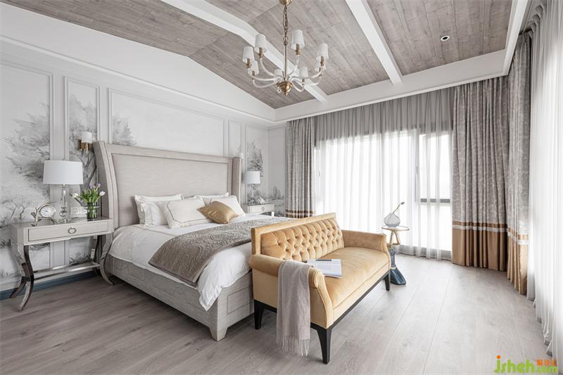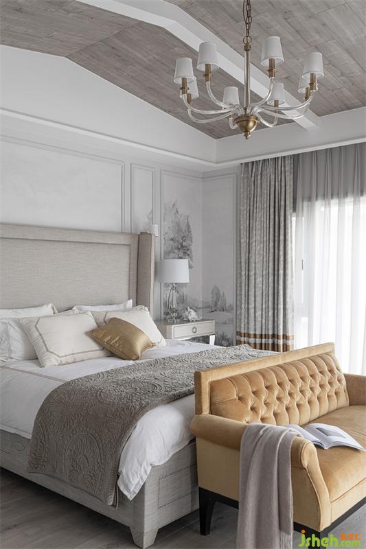 為了保持主臥的原始層高,更具空間感,我們將原始異形頂改造為穹頂造型。90°造型落地窗,花園的美景將盡收眼底。優(yōu)雅的壁畫、精致的金屬吊燈、典雅的床尾沙發(fā)、拼色窗簾,空間的氛圍如在度假一般感受。