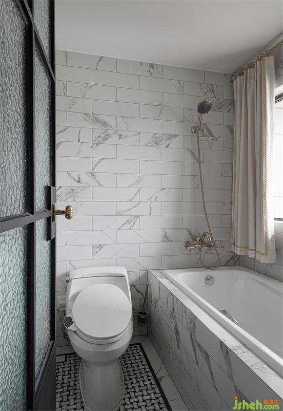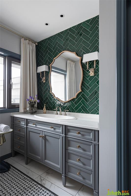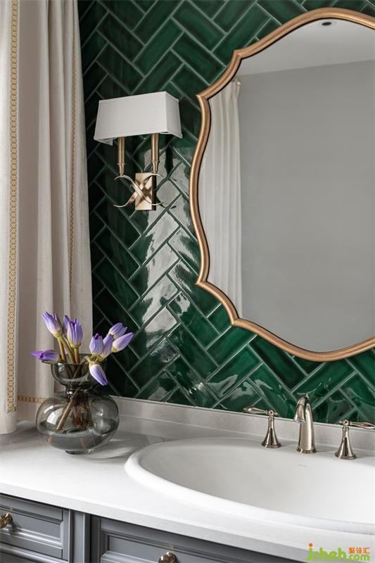 黑白的編織紋地磚是步入衛(wèi)生間的第一份儀式感, 精致巧妙的復(fù)古造型面鏡與典雅的翡翠綠人字拼瓷磚進(jìn)行搭配,經(jīng)典與摩登交融其中,是能夠體會(huì)、觸碰得到的柔情蜜意。