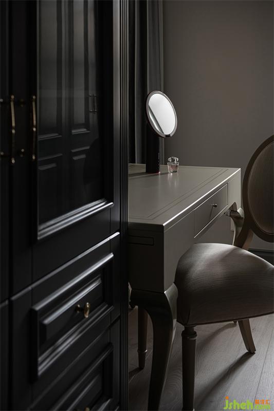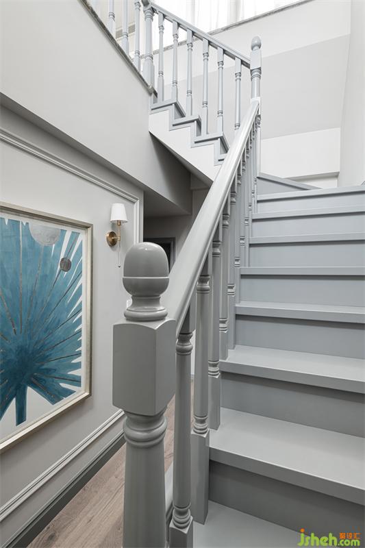 樓梯整體采用高級(jí)灰打底,墻面印象派畫(huà)作用以跳色,灰與藍(lán)的搭配充滿戲劇效果,一抹藍(lán)色躍然而出。線條在此空間被運(yùn)用的淋漓盡致,墻面石膏線條、實(shí)木踢腳線、實(shí)木門(mén)框線、樓梯羅馬柱線條,每一個(gè)細(xì)節(jié)的處理與點(diǎn)綴,都是設(shè)計(jì)者對(duì)風(fēng)格整體把控能力展現(xiàn)。
