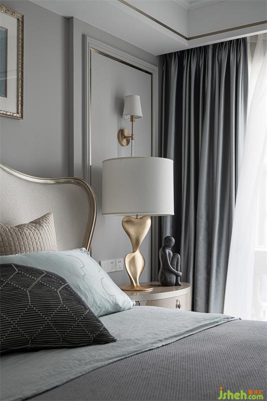 三樓為屋主夫妻兩的主臥,暖灰、蒼藍(lán)、蜂蜜色三色為空間主色調(diào)。蒼藍(lán)色被大面積的用到了空間各處呈現(xiàn)出一種溫柔情緒,如身處藍(lán)天白云微風(fēng)拂面的海邊。