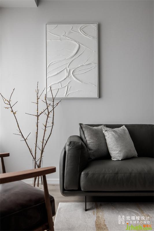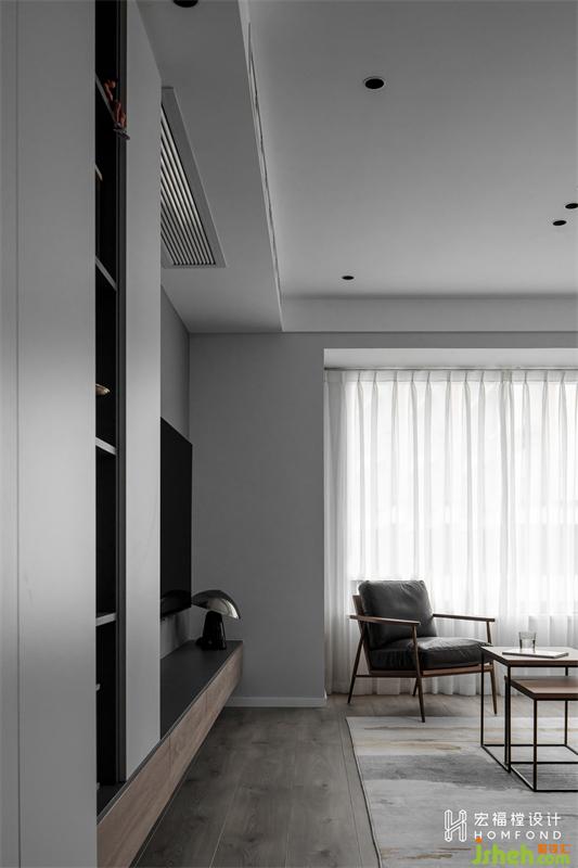 相信靜止這樣細(xì)膩的特質(zhì)在繁雜喧囂的世界里很重要,所以我們大量將空間留白,黑灰作為空間輔助色,營造極簡的空間氣氛。木質(zhì)地板則用于遞減黑白灰?guī)淼睦渚?。考慮到屋主平日生活里的隨意個(gè)性,所以我們將人、空間、物品三者之間進(jìn)行平衡,家具、軟裝陳列簡化,僅留存日常必需品,最大化升級(jí)空間給予他們的自由舒適度。