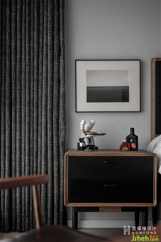 按照屋主意愿,家居設(shè)計(jì)將臥室的主衛(wèi)拆除,面積與次臥均分,主臥空間增大的同時(shí)將次臥設(shè)計(jì)為獨(dú)立的衣帽間。延續(xù)公共區(qū)域色調(diào),減少物品的陳列堆放,墻面右側(cè)進(jìn)行線條分色處理,與左側(cè)窗簾進(jìn)行平衡融合。