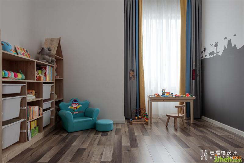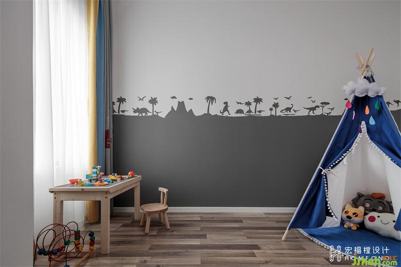 小孩暫時與父母同睡主臥,兒童房暫時是他的玩耍區(qū)域。所以我們將一側(cè)墻面設(shè)計為可隨意圖畫黑板漆,并在分界處呈現(xiàn)可愛的大自然圖形。另一側(cè)則放置圖畫書籍、玩具,整體氛圍可愛輕松。仿佛是一處坐落在家里的小型樂園。