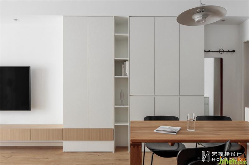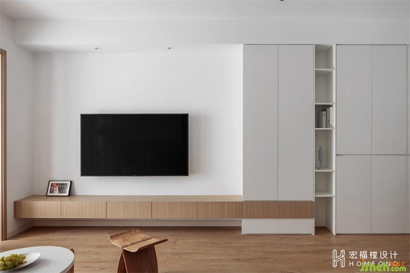 沿進(jìn)門右側(cè)墻壁設(shè)計(jì)900mm+2540mm的玄關(guān)區(qū)域,并與電視墻連為一體,在視覺效果上拉長(zhǎng)整個(gè)房間的同時(shí)為出入居所增添儀式感。