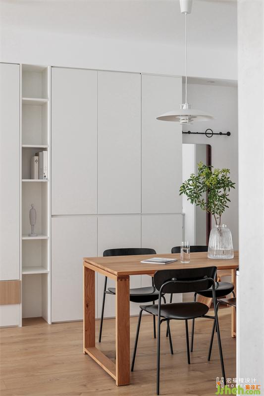 墻面則整體大面積留白去提高空間的明度感,并搭配富有質(zhì)感的原木材質(zhì),在表達(dá)干凈,清爽的同時(shí)不缺乏溫潤(rùn)的氛圍感。