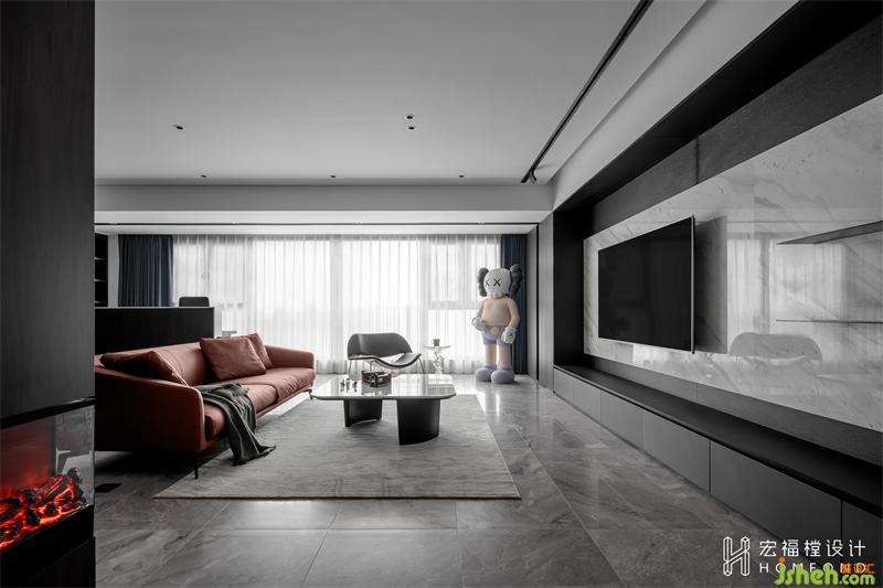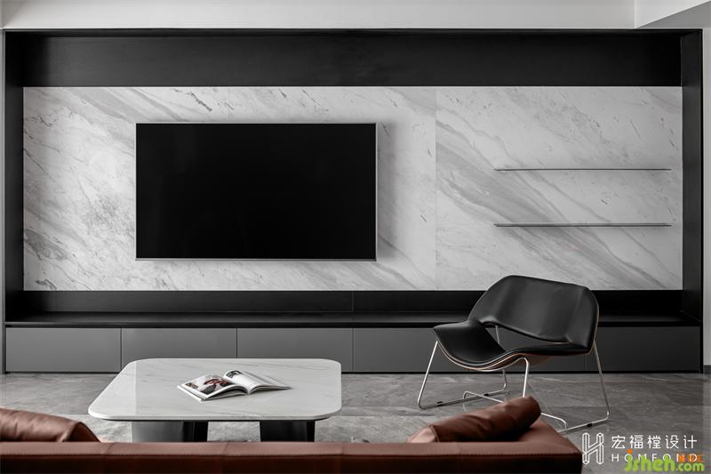 整體采用柔光云灰色地磚進(jìn)行鋪貼,讓公共區(qū)域簡潔有力的同時更有高級感。4690mm長度的電視墻拉伸了整個空間的橫向感,大理石材質(zhì)與黑色護(hù)墻板進(jìn)行疊層搭配,用基礎(chǔ)的線面組合釋放無限的空間思維,在視野上延伸寬度與深邃感,底部的收納柜放置屋主未開封的手辦使用。