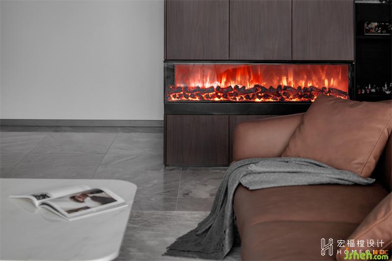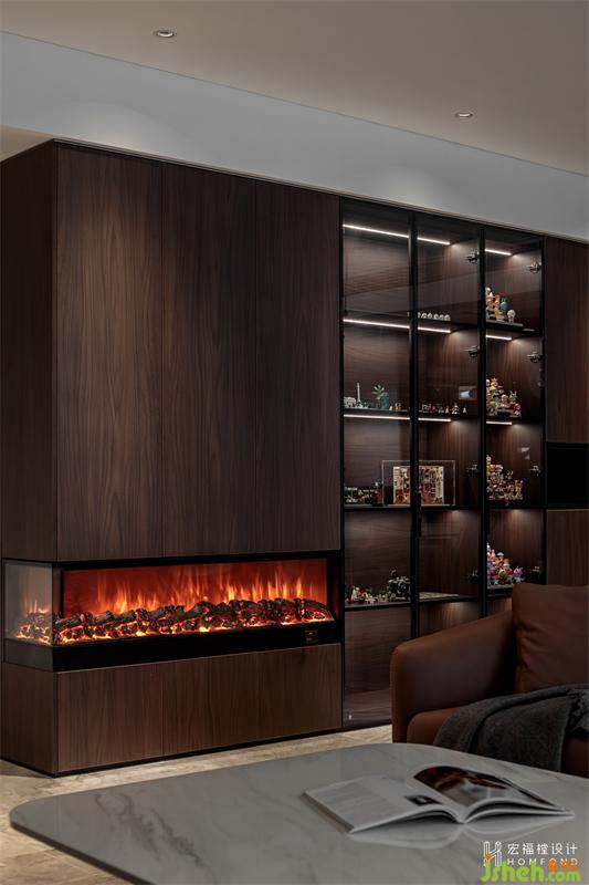 定制的電子仿真壁爐,除中和冷調(diào),讓居家氛圍更溫馨外,還有風(fēng)口為空間輸送暖氣。L型柜體挨著走廊的方向我們將其中間位置設(shè)計為1200mmx600mmx400mm(長、寬、深度)的開放式儲物形式,可放置屋主購買的家用咖啡機(jī)及一些常用水杯,下方則是抽屜柜,用于放置咖啡粉、果汁等食品類生活物品,使用起來非常方便。