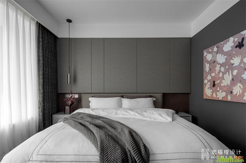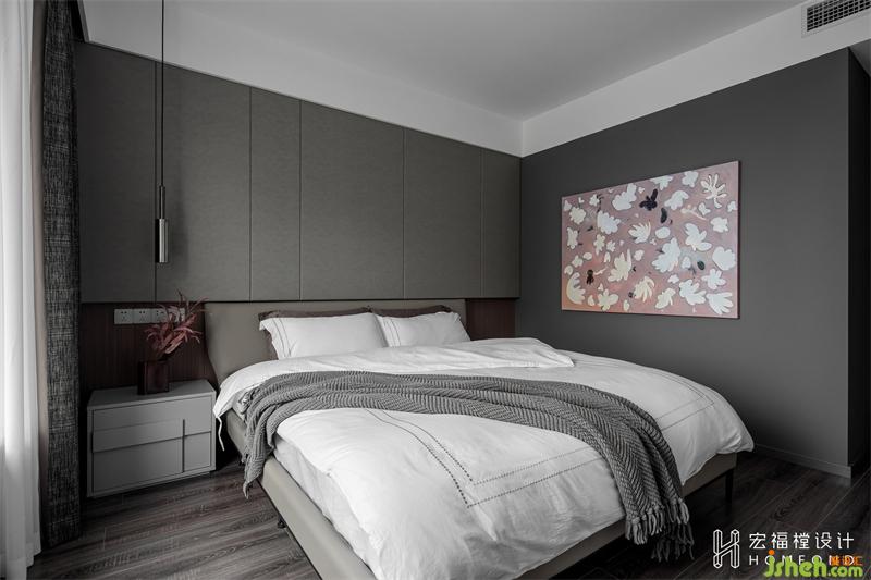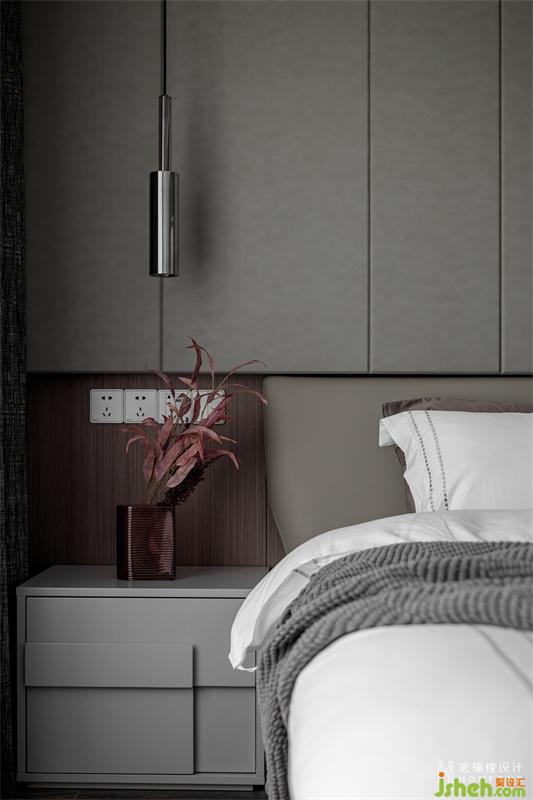 主臥由于收納空間不足,所以調(diào)整了衛(wèi)生間與臥室之間的距離,設(shè)計為1820mmx1670mm的L型衣帽間。整體風(fēng)格去掉過于硬朗的黑色,延續(xù)灰調(diào),搭配柔和的粉色,氛圍兼具優(yōu)雅與浪漫,打造別樣夢境。