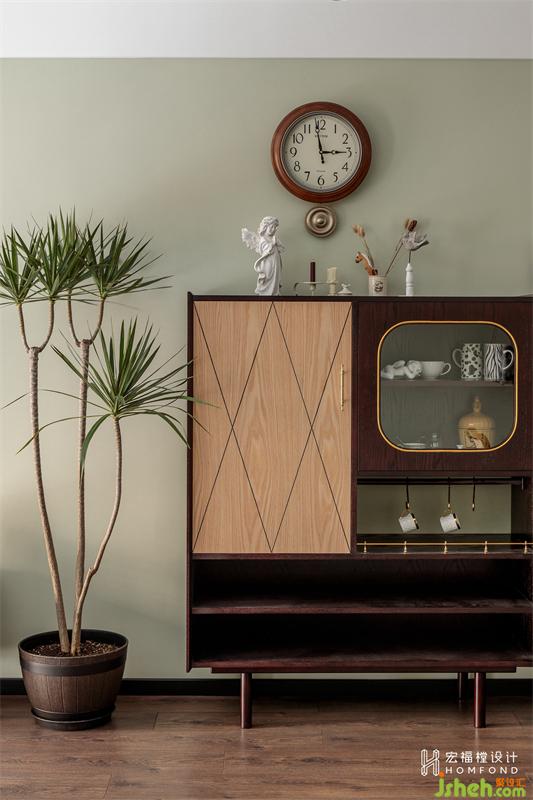 區(qū)別于常規(guī)客廳的擺放形式,復(fù)古家具、植物、帶來視覺上的樂趣。陳列柜里放滿的收集古典小物件大多是珍珍偶爾發(fā)現(xiàn)并購入的喜愛物品。不用上班的時(shí)候,早晨一起床,珍珍首先會(huì)將音樂打開,然后在音樂和漾漾的陪伴下開始做早飯、看書、打理植物,心境便隨之變得悠閑起來。