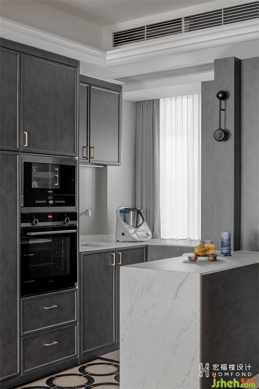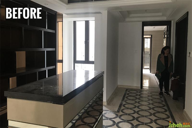 原始玄關(guān)為酒柜+吧臺,顏色深沉,完全與屋主生活習(xí)慣及氣質(zhì)不符。我們將其拆除后改造為3250mm+580mmL型儲物空間+西廚,再根據(jù)女屋主身高打造長1200mmx寬600mmx高880mm的島臺,方便她平日里為女兒烘焙蛋糕,準(zhǔn)備水果使用。島臺右側(cè)增添1980mmx380mm的鞋柜,滿足家人的鞋類放置。區(qū)域色彩改變?yōu)榛疑{(diào),通過材質(zhì)與紋理的變化營造優(yōu)雅而富有質(zhì)感的空間氛圍。