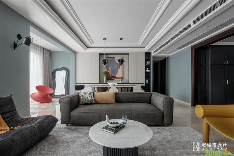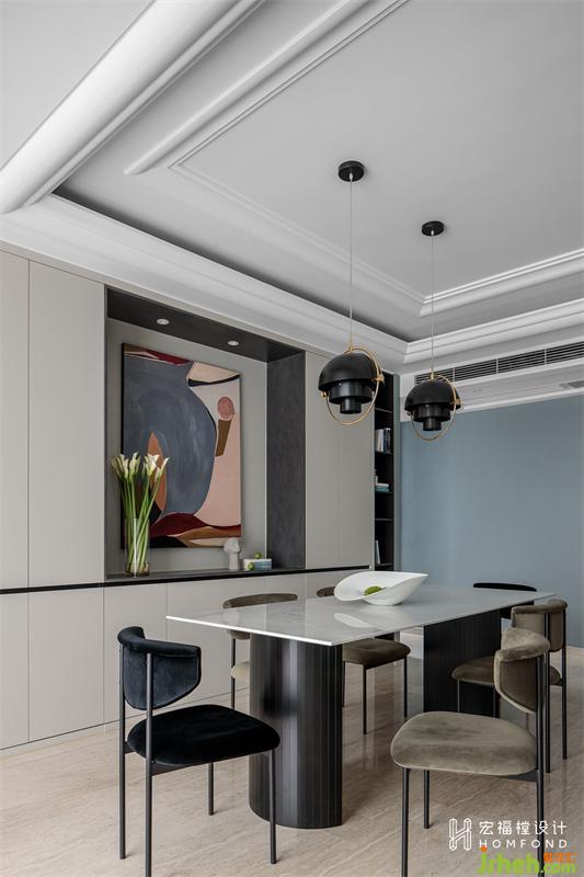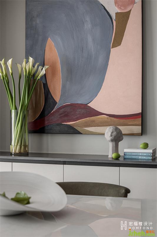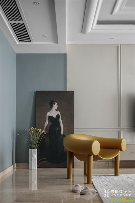 家居設(shè)計保留原始吊頂?shù)氖嗑€條及地面瓷磚,拆除電視墻,重刷乳膠漆,是將女屋主喜愛的灰、藍、綠進行中和后調(diào)配制成。陽臺納入客廳區(qū)域,增加空間亮度,讓精裝房在視覺上顯得更為清爽。輕快明媚的色彩及充滿藝術(shù)氣質(zhì)的掛畫、沙發(fā)、凳椅被拆分重新組合到空間中,表現(xiàn)出一種令人難以忽視的美感。