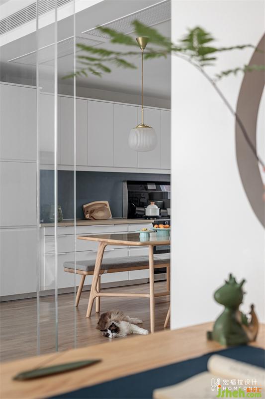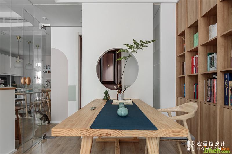 二人平日里喜愛閱讀,所以定制了一面2800mm長度的書柜墻。女主人給每一格空間都做了清晰的分類,中國古詩詞、世界名著、現(xiàn)代小說、人物傳記、藝術(shù)畫冊(cè)以及夫妻倆的專業(yè)書籍等等,呈現(xiàn)出舒適美感的同時(shí)又方便檢索。在滿足書房功能后,給予了一部分空間給相鄰的貓舍使用,同樣以玻璃材質(zhì)進(jìn)行區(qū)域分隔,流通的光線在視覺上似分而連。