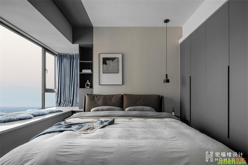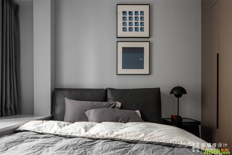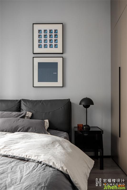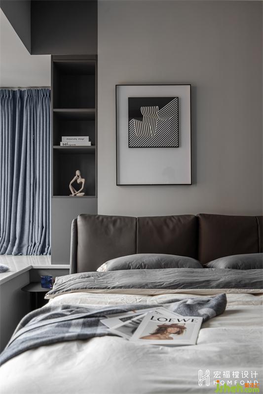 主臥在延續(xù)外部風(fēng)格的基礎(chǔ)上,簡(jiǎn)單的對(duì)空間進(jìn)行局部分割和色調(diào)設(shè)計(jì),床頭左側(cè)因結(jié)構(gòu)懸空,所以改造400mm為展示柜,并進(jìn)行墻面分色,在視覺(jué)上與衣柜的高級(jí)灰進(jìn)行左右對(duì)應(yīng)。