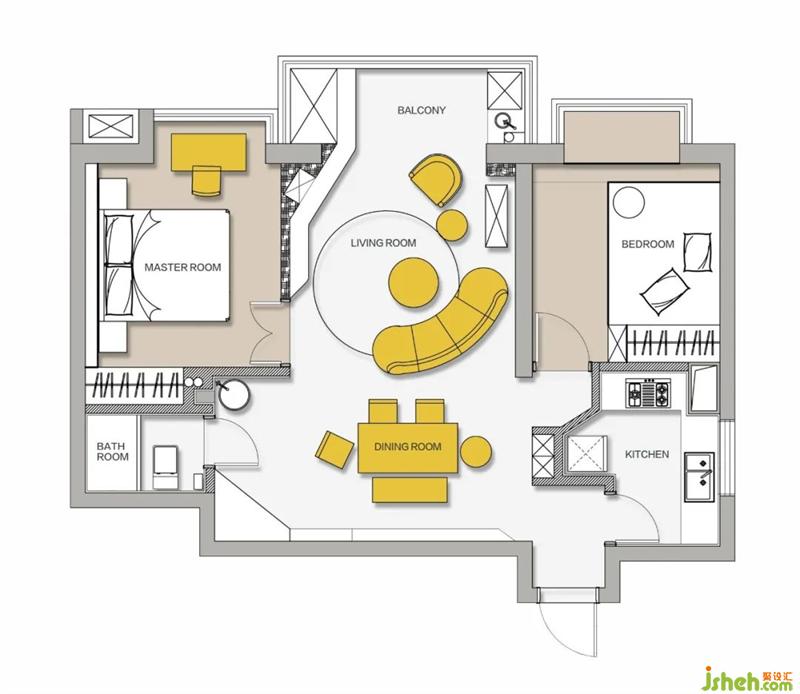 ? 借次臥少許面積與入戶走廊合并改造為玄關(guān),增加儲物的同時利用凸處擴(kuò)大廚房面積,放置冰箱