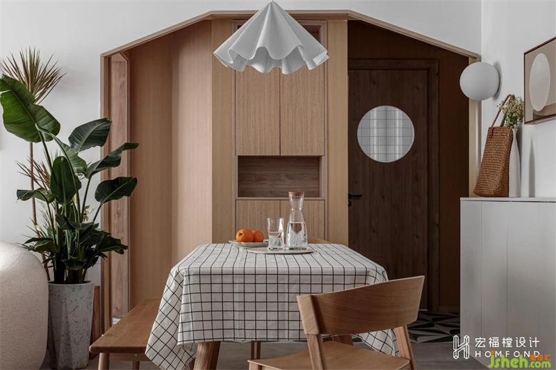 在有限的尺度下,順勢而為,利用原戶型硬傷部分(入戶無遮擋,餐廳面積不合理等),加入儲物功能并將其塑造為幾何形態(tài),打造出空間的趣味性和亮點。