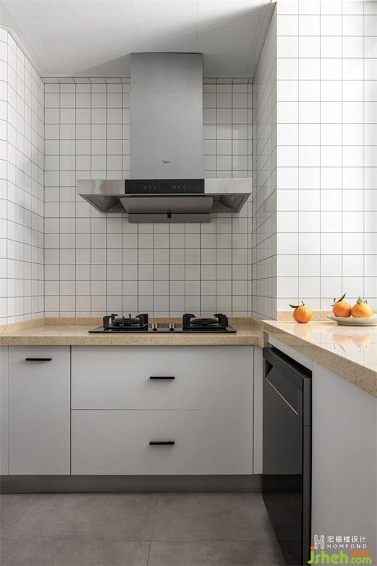 而因原始廚房面積過小,缺乏儲物功能,我們則合理利用玄關(guān)凸處擴(kuò)大空間,順利將冰箱放置,一舉兩得。