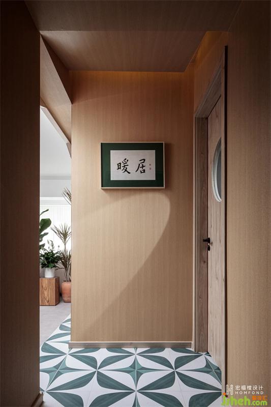 利用原始入戶空間設(shè)計一處R型遮擋玄關(guān),并利用戶頂橫梁改造為斜面坡頂,營造出戶外木屋的自然氛圍感。在響應(yīng)日常鞋類存儲的使用需求的同時又賞心悅目,獨特的墨綠星空花磚成功將居住者從繁雜庸擾的外部世界引入“暖居”。
