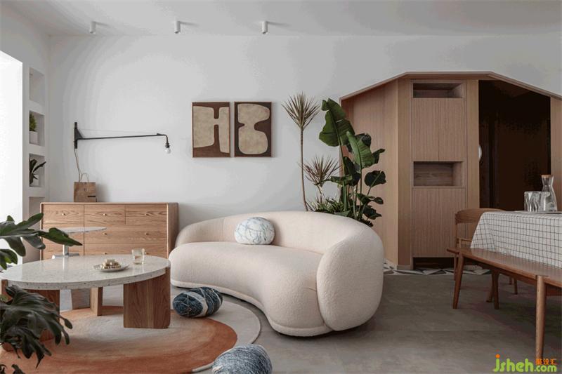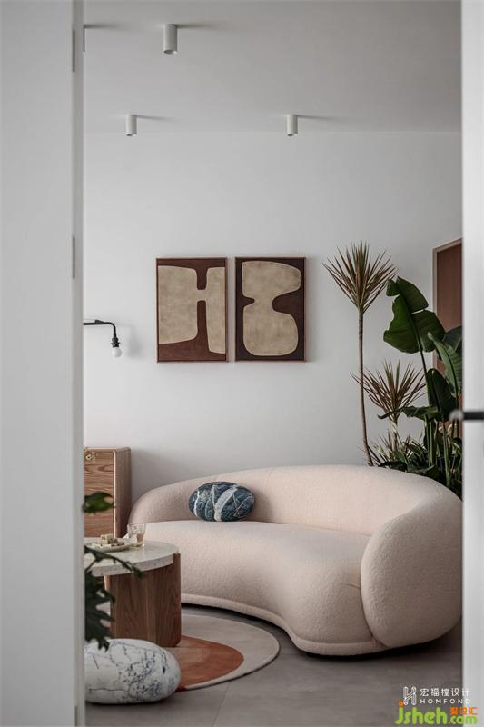 不同于傳統(tǒng)的客廳陳設(shè)形式,沙發(fā)具有圓潤的線條感,立體飽滿,靠客廳邊緣位置斜放,與環(huán)繞客廳的綠植剛好成為一處端景。留出的空間部分恰好與玄關(guān)、餐廳、陽臺(tái)動(dòng)線形成有趣靈活的互動(dòng)關(guān)系。