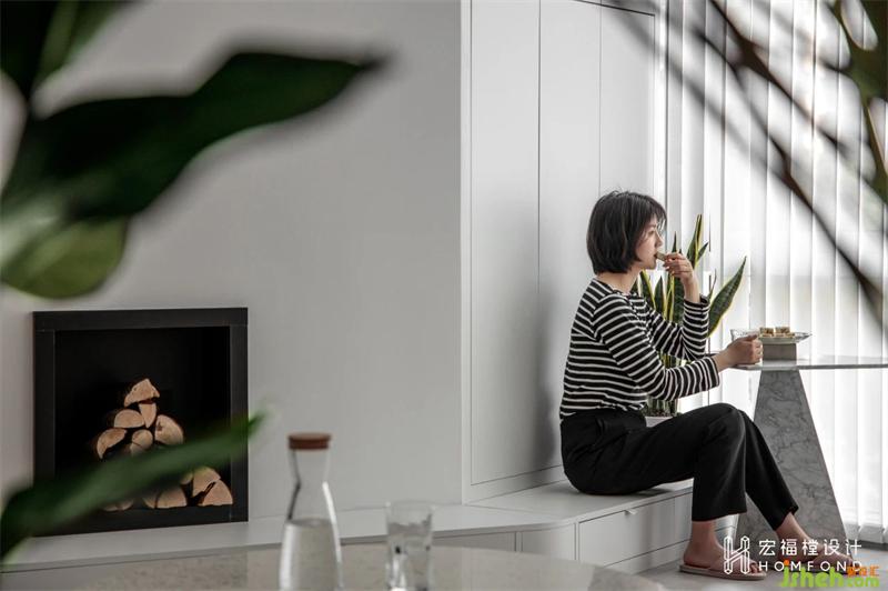 納入客廳的陽臺(tái)也保留住了原始功能,利用豎百葉將自然光線柔和、過濾后再引入室內(nèi)。在地臺(tái)柜旁放置小邊幾,不論晴天或陰雨天,品上一杯清茶,吃上一塊糕點(diǎn),心情便會(huì)隨之搖曳游動(dòng)。