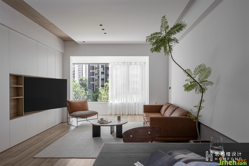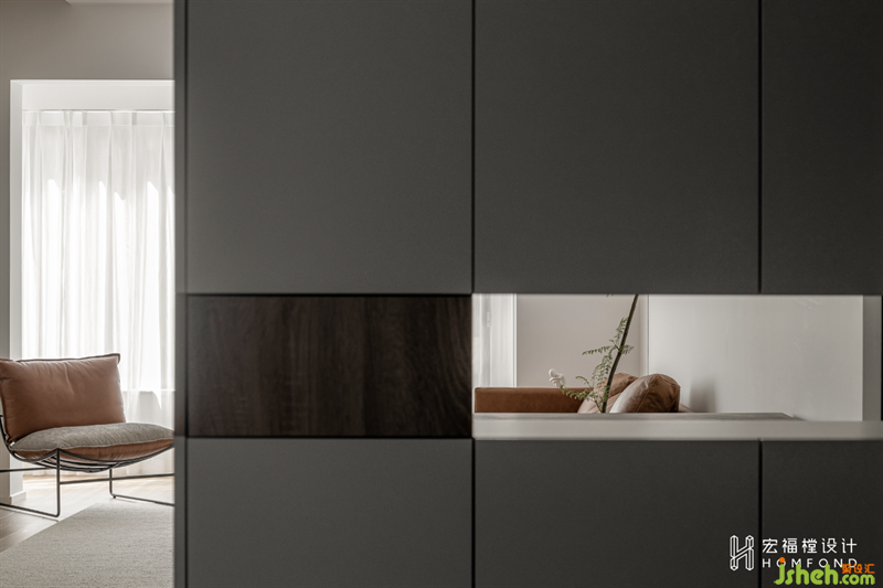 家居設(shè)計(jì)利用大小不同的幾何感體塊,為空間帶來視覺上的平衡秩序。對(duì)玄關(guān)儲(chǔ)物柜進(jìn)行細(xì)節(jié)尺寸的考量與把控,在坐下?lián)Q鞋的時(shí)候,即可通過故意留出的縫隙處“窺探”客廳全貌,并通過此舉讓身處在內(nèi)與外空間中的家人感受到溫暖的情感互動(dòng)。