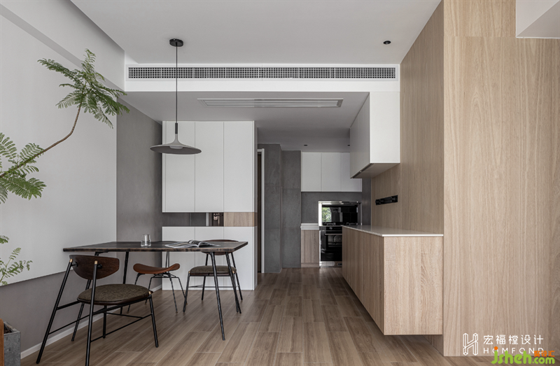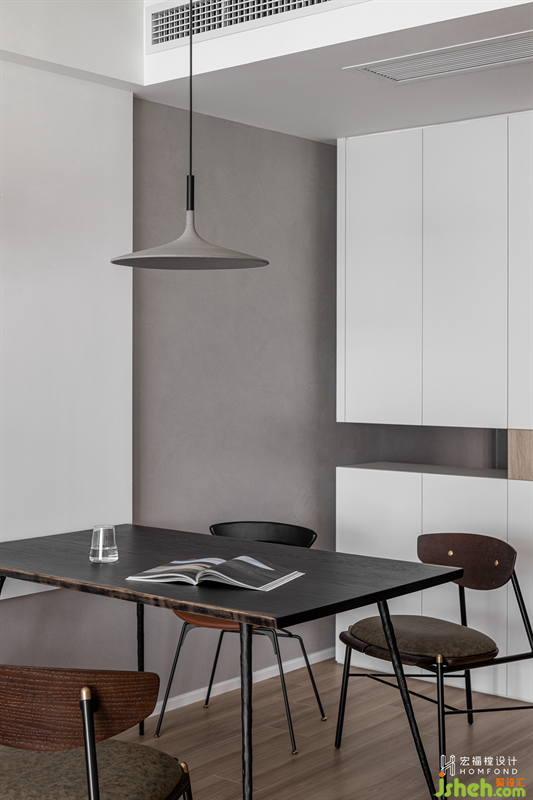 延伸至餐廳墻面的灰色藝術(shù)涂料與客廳的白色墻體交匯,營造出隨性自在的氛圍感。它與玄關(guān)、中西廚以一種近乎有序的方式鏈接了起來,而橡木自然邊餐桌,點(diǎn)綴了秩序之中的靈動力。