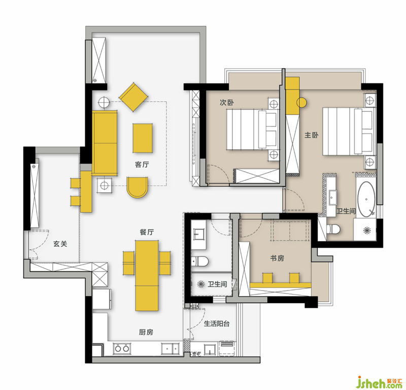 由于目前是兩人常住計劃三五年后再增加成員,于是我們根據需求反推戶型不做調整。兩間房完整保留,將重點轉到功能格局和動線的優(yōu)化上。