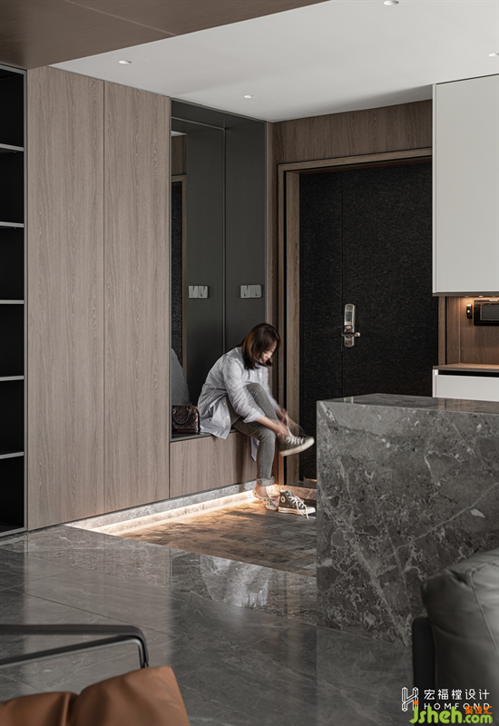 一進入室內就被入口處的層次感所吸引。原木飾面、極簡灰大理石、年輪紋理實木地板等三種材質結合,營造出一種頗高級的審美情趣。