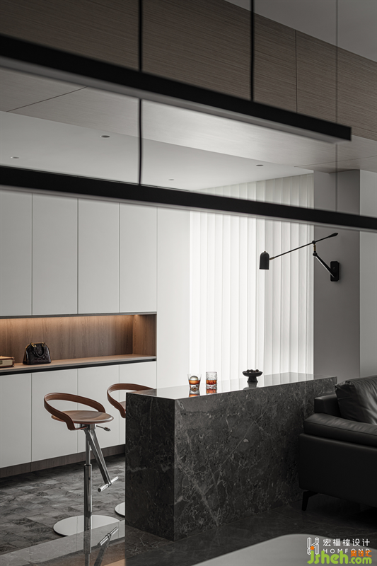 在開闊的玄關處增設吧臺作為玄關與客餐廳之間的阻隔。既劃分了空間又創(chuàng)造出視覺上的連接感,與公區(qū)空間隔而不斷、緊密相連,營造出空間之間的局部互動。