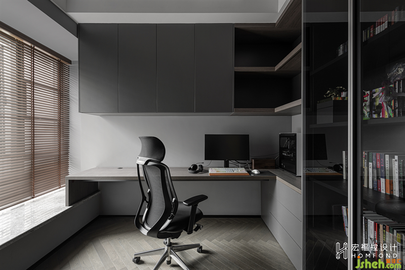 書房整體大氣時尚,體現(xiàn)了屋主沉穩(wěn)、不拘一格的氣質(zhì)品味。細(xì)長型的結(jié)構(gòu)中,打造出一個兩層夾角收納區(qū)域恰好能滿足屋主居住日常的使用需求。
