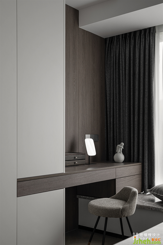 主臥的線條和裝飾極為考究,L型墻板+鯨魚灰皮質(zhì)硬包,呈現(xiàn)出與居者一致的審美情緒和生活哲學(xué)。妝臺沿用電視墻一致的設(shè)計(jì)手法,粗細(xì)線條材質(zhì)糅合穿插,始終維持形態(tài)統(tǒng)一的氛圍感。