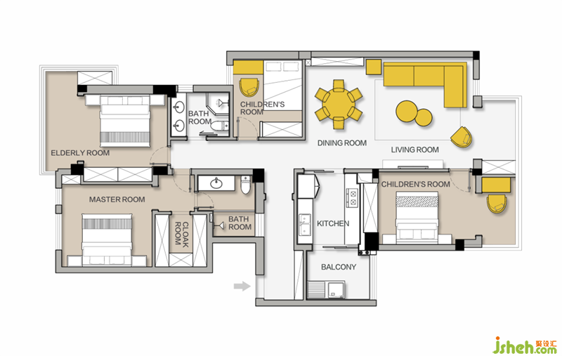 屋主夫妻與父母、兩個(gè)孩子六人一起居住,原來的住房因?yàn)闆]考慮二胎的需求,所以妹妹出生后一直住在爺奶奶房間,隨著妹妹的長(zhǎng)大,無論是活動(dòng)、收納、還是休息空間都變得繁雜擁擠。因?yàn)槠綍r(shí)工作較忙,所以希望新的居住空間能夠在既滿足生活需求,又能夠有舒緩、放松的生活氛圍。