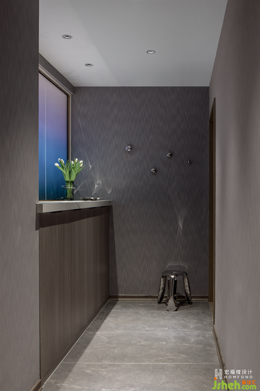 優(yōu)化入戶動(dòng)線,重新劃分生活陽臺(tái)空間,并以藝術(shù)玻璃搭配鞋柜的方式將其隔開,獨(dú)立玄關(guān)。漸變的藝術(shù)玻璃除了有一定的透光作用之外,也遮蔽了生活陽臺(tái)的雜物,并豐富了進(jìn)門的視覺效果。