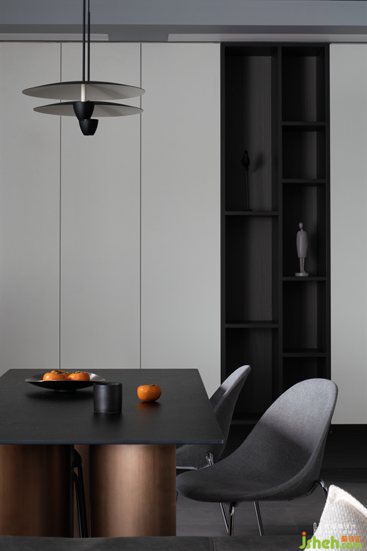 在許多年輕人的居家區(qū)域排行中,餐廳的重要性遠(yuǎn)勝于客廳。因原始戶型格局,餐廳獲得了開門見山的位置,它在擁有用餐功能的同時也兼具入戶后第一視覺的重要地位。所以我們選擇了有著獨特金屬腳架結(jié)構(gòu)造型的餐桌,在穩(wěn)固堅韌的基礎(chǔ)上帶來未來感的美學(xué)體驗。