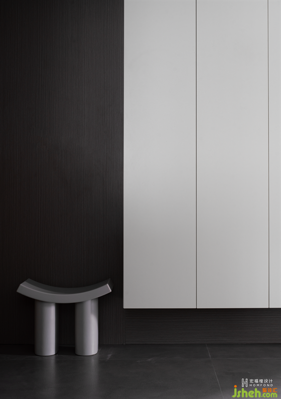 作為公共空間中的緩沖地帶,走廊以延展視覺和氛圍呈現(xiàn)。一幅抽象手繪畫,與背景木皮材質(zhì)糅雜出多種感官體驗。在游走與停留之間,具象與抽象進(jìn)行多元敘述。