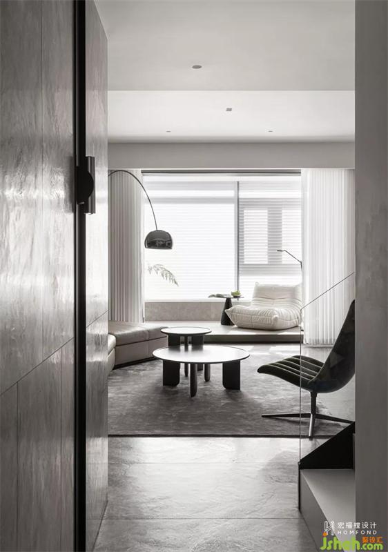 抬高120mm形成地臺,陽光被牽引入內(nèi)。光線在百葉過濾后與空間形成一種動態(tài)且安靜的交流,墻面與地面之上的光影被加強(qiáng)、模糊以及擴(kuò)展,逐漸弱化了空間的重量。