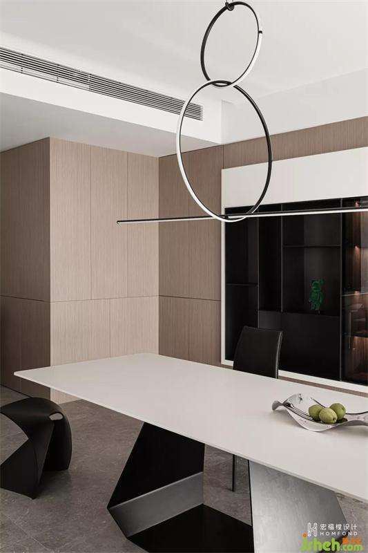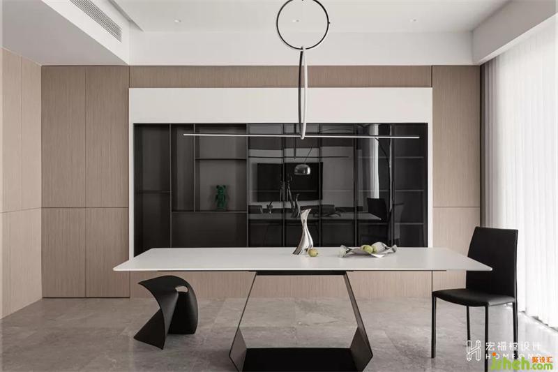 木飾材質(zhì)貫穿玄關(guān)與餐廳空間,作為視覺延伸,形成整體的框架結(jié)構(gòu)。寬闊但體態(tài)輕盈的Bonaldo Amond餐桌、趣味橫生的Flos Arrangements餐燈、可塑性極強(qiáng)的table chair,注重體現(xiàn)多元化又獨立的風(fēng)格,將生活品質(zhì)向上發(fā)展。