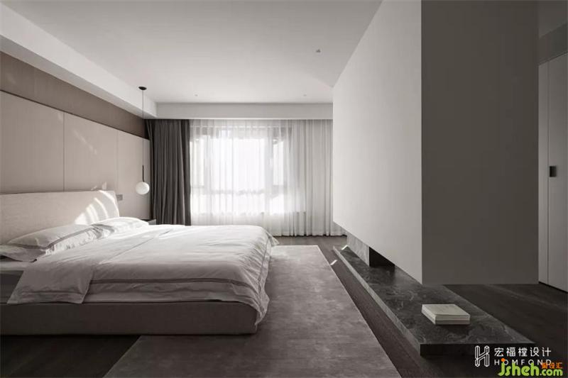 加入更豐富多元的空間體驗以及游走其間的趣味性,通過細致把控墻體的重量,將電視墻體進行懸空。并利用足夠的厚度將另一面設計為儲物展示空間,提升臥室內部的互動及功能性。