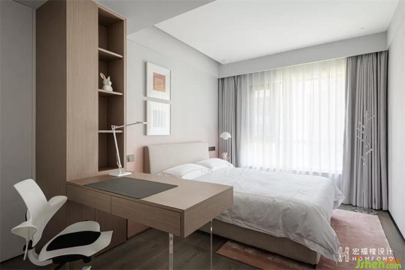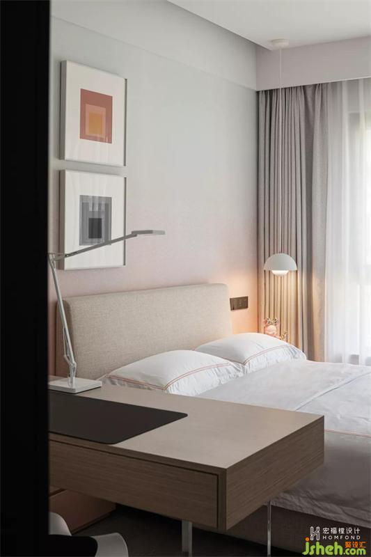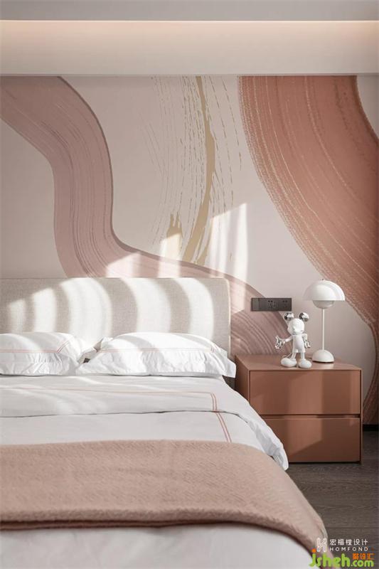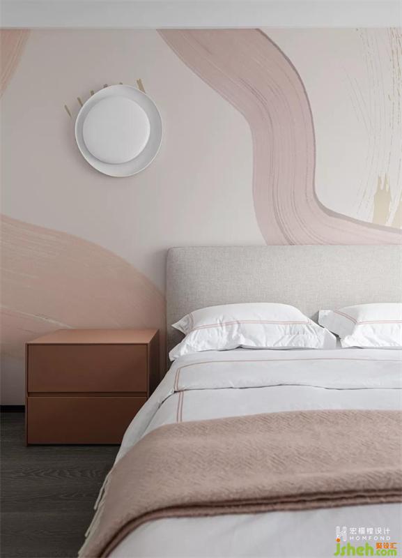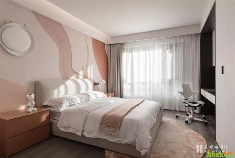 粉色依然作為另一間兒童房的基礎色,柔性氣質得以蔓延。取消臥室原本附帶的衛(wèi)生間,擴大面積,滿足起居與學習功能,漸變的浪漫墻畫,氣氛輕盈通透,創(chuàng)造出超脫現(xiàn)實之外的夢幻與臆想。