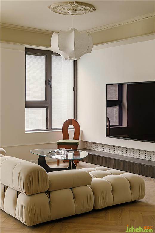 原始餐廳正對入戶門,私密性和采光比較差,家裝設(shè)計(jì)師將餐廳移到客廳區(qū)域,公用陽臺(tái)采光,也能滿足業(yè)主就餐看電視的娛樂功能;