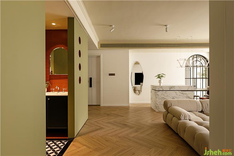 清新的橄欖綠色清新的橄欖綠色(色號:多樂士 70YY25/200)由玄關(guān)延續(xù)至衛(wèi)生間,家裝設(shè)計(jì)將空間進(jìn)行打破與重組,實(shí)現(xiàn)一個(gè)室內(nèi)的整體模塊承擔(dān)不同功能分區(qū)(玄關(guān)+干區(qū))。