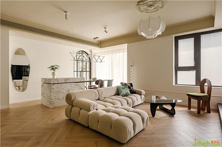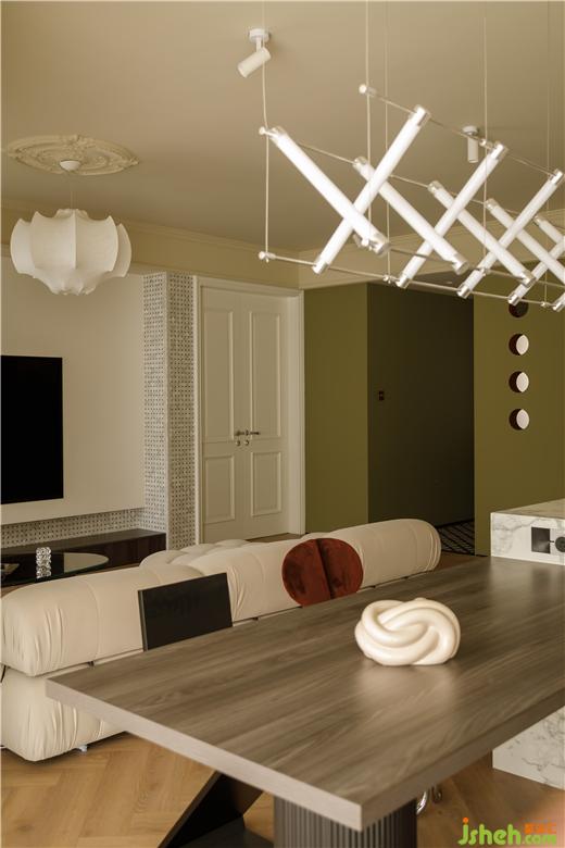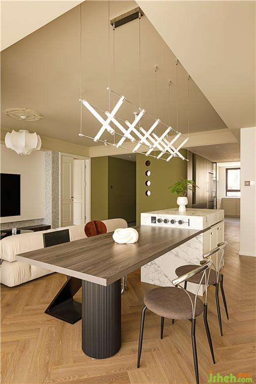 客餐廳保持原始2.75米層高以及橫廳優(yōu)勢,整個(gè)客餐廳擁有大平層的既視感;家裝設(shè)計(jì)用乳膠漆做墻頂分色處理,拉伸視覺效果,同時(shí)增加整屋的層次感;同時(shí)古典的蠶絲等增加空間的柔軟度,整體和諧自洽。
