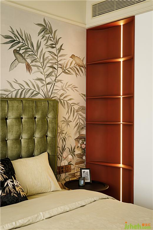 入戶玄關(guān),家裝設(shè)計(jì)師選用帶弧度的轉(zhuǎn)角,和橄欖綠為一種視覺沖擊,既在風(fēng)格上跟整屋保持一致,也能在功能上滿足收納,同時(shí)干區(qū)衛(wèi)生間有個(gè)鏈接;玄關(guān)柜用上下分體的設(shè)計(jì),用黑色作為腰線,顏色更高級,同時(shí)也能在腰線處設(shè)計(jì)一個(gè)擺放花瓶的位置;