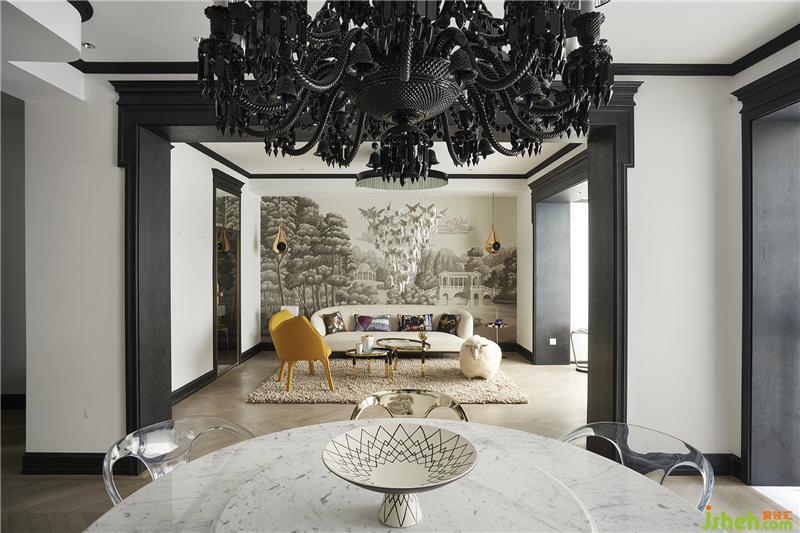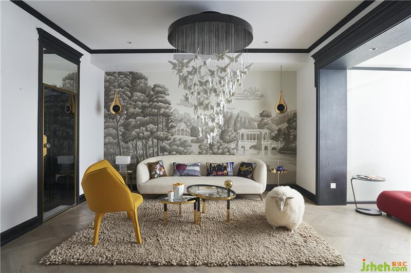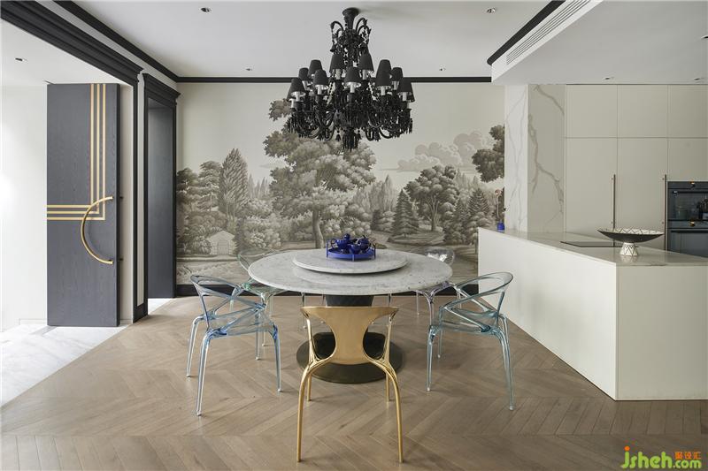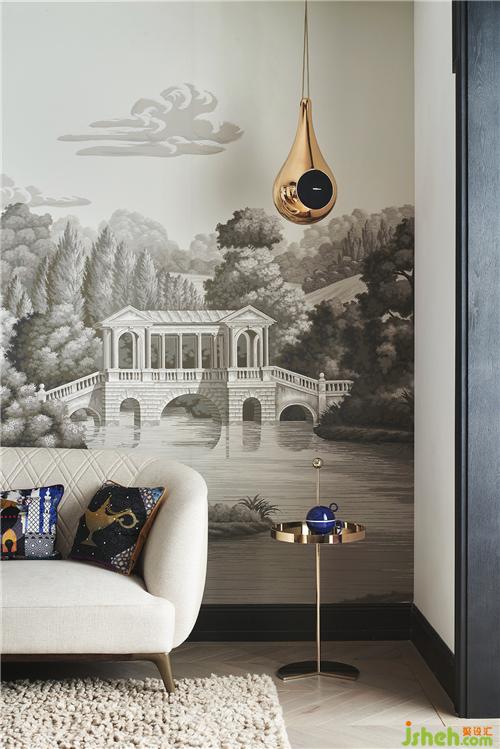 于是可以看到,一樓會(huì)客廳來(lái)自意大利Garvan的水滴形音響和背后的de Gourney 風(fēng)景壁紙構(gòu)成了一副令人遐想的畫卷。坐在這里就好像在森林里聽(tīng)音樂(lè)藝術(shù)吊燈上如瀑布般垂吊的小精靈閃爍的光芒,而靈感就開(kāi)始在心里的某個(gè)角落萌發(fā)……