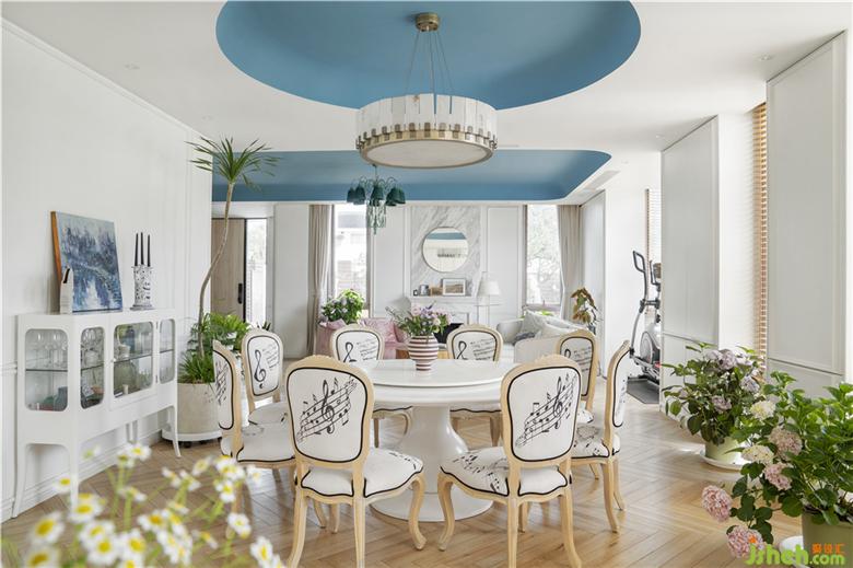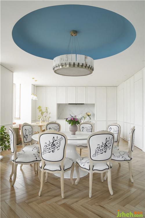 侯胤杰敏銳捕捉到女主人對(duì)遼闊海域的向往,明媚的藍(lán)只是線索,與之相伴的開闊與通透才是Ada鐘情的內(nèi)核。于是,設(shè)計(jì)師將一樓的非承重墻體全部拆除,一層空間呈現(xiàn)完全開放的姿態(tài),天花板上的兩塊小小“海域”,方型對(duì)應(yīng)客廳,圓形對(duì)應(yīng)餐廳。吊頂邊緣都細(xì)細(xì)打磨出精致的弧度,模仿常年被海水沖刷后的光滑邊緣。