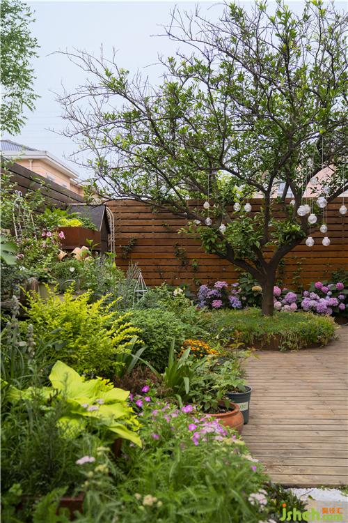 整個(gè)庭院都是Ada的專屬,花葉繁盛、光影溫柔,防腐木墻圍合出一方美妙花境,主人用大大小小的盆栽和不同的花器打造出錯(cuò)落有致、四季皆美的園景。