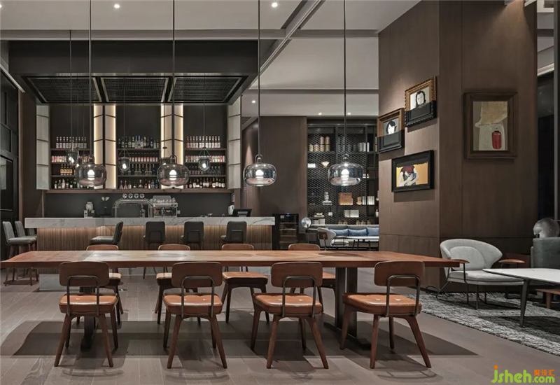 大堂側(cè)面的HOLA bar打造了一個集咖啡、精釀、文化等現(xiàn)代生活方式于一體的多元共享社交空間,是商務(wù)、休閑、移動辦公的個性之選。設(shè)計融合了工業(yè)型格與復(fù)古輕奢創(chuàng)意元素,將復(fù)古重現(xiàn),結(jié)合當(dāng)?shù)爻啥嘉幕孕【凹毠?jié)呈現(xiàn),打造輕松現(xiàn)代感的社交場所,為“旅享家”打造新型社交體驗。