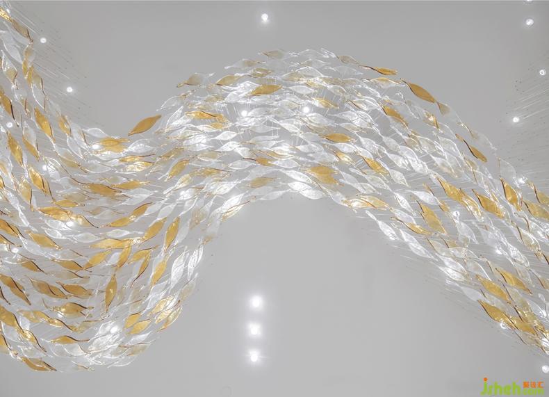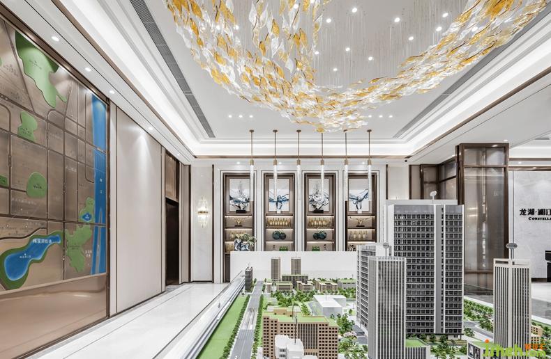 再入,真正帶來視覺沖擊的是沙盤模型區(qū)和洽談區(qū)的藝術燈具造型,不僅模擬了湘江的動態(tài)美,室內設計師運用湘江之水的藝術形態(tài),局部點綴跳躍橙黃色,賦予空間更加形象生動的生機感和空靈意境,給整個空間帶來一種和諧生態(tài)的審美體驗。