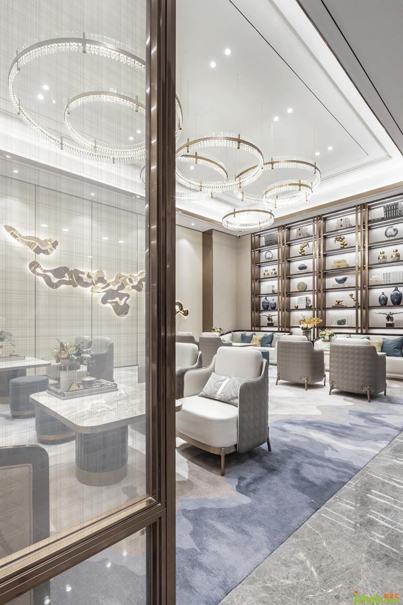 跟隨著“水”元素的蹤跡來(lái)到通透明亮的VIP私人洽談區(qū),以水藍(lán)色為主的優(yōu)雅色調(diào),以極其平緩而雅致紋路溢出了動(dòng)與靜、虛與實(shí)的意蘊(yùn)。人們交談?dòng)诖?,水晶燈低調(diào)而奢華的造型閃爍出淡淡光華,室內(nèi)設(shè)計(jì)師渲染出一個(gè)未來(lái)可期的生活空間。