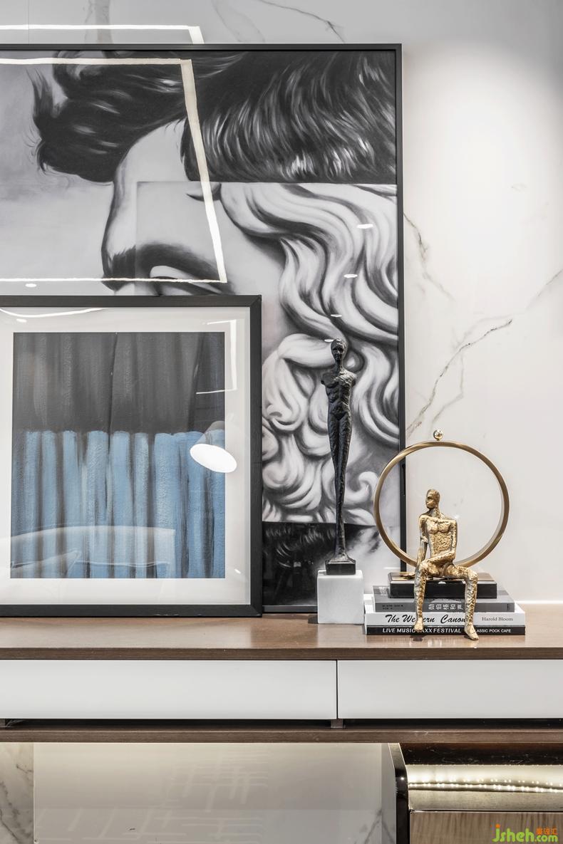 在這個戶型中,她是一位喜歡旅行,并熱愛美食的90后職場精英,室內(nèi)設(shè)計師設(shè)計上,就不再是尋常簡單的空間表現(xiàn),而是將注意力放在對藝術(shù)的表達——用現(xiàn)代藝術(shù)概念,構(gòu)建整體。色彩上褪去繁重的疊加處理,取之簡約高級灰黑兩色,以金屬的跳躍色撥動空間節(jié)奏,這里是一個當代女性所期盼的理想空間之一,精巧不過,舒適不過。