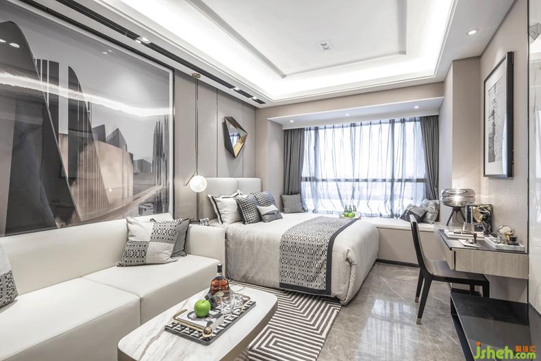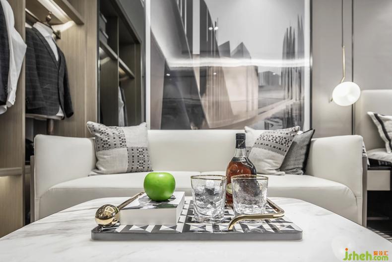 室內(nèi)設(shè)計(jì)師創(chuàng)作中最為巧妙的一點(diǎn)是利用衣柜隔斷空間,并根據(jù)元素的不同區(qū)分差異性;客廳所具有的規(guī)整性嚴(yán)謹(jǐn)感,都是通過建筑畫、幾何紋理、威士忌酒文化所打造出來的奢華高雅,不同于至簡(jiǎn)至奢的入口處,也不同于悠然隨性的臥室。